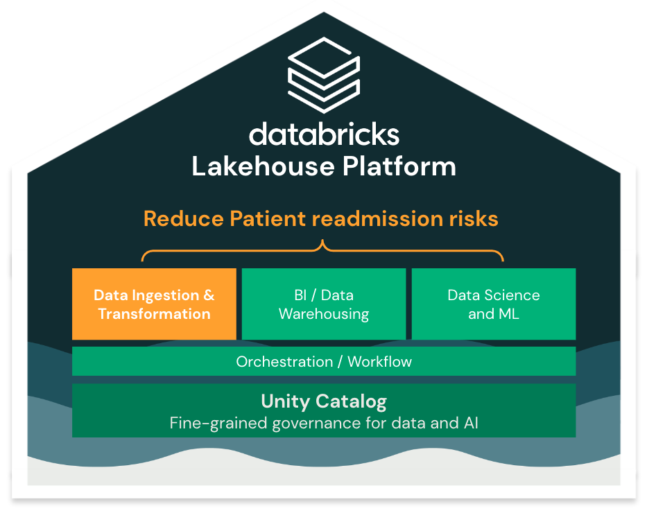 To predict patient re-admissions, we'll build an end-to-end solution with the Lakehouse, leveraging data from external and internal systems: patient demographics, logitudinal health records (past visits, conditions, allergies, etc), and real-time patient admission, discharge, transofrm (ADT) information...